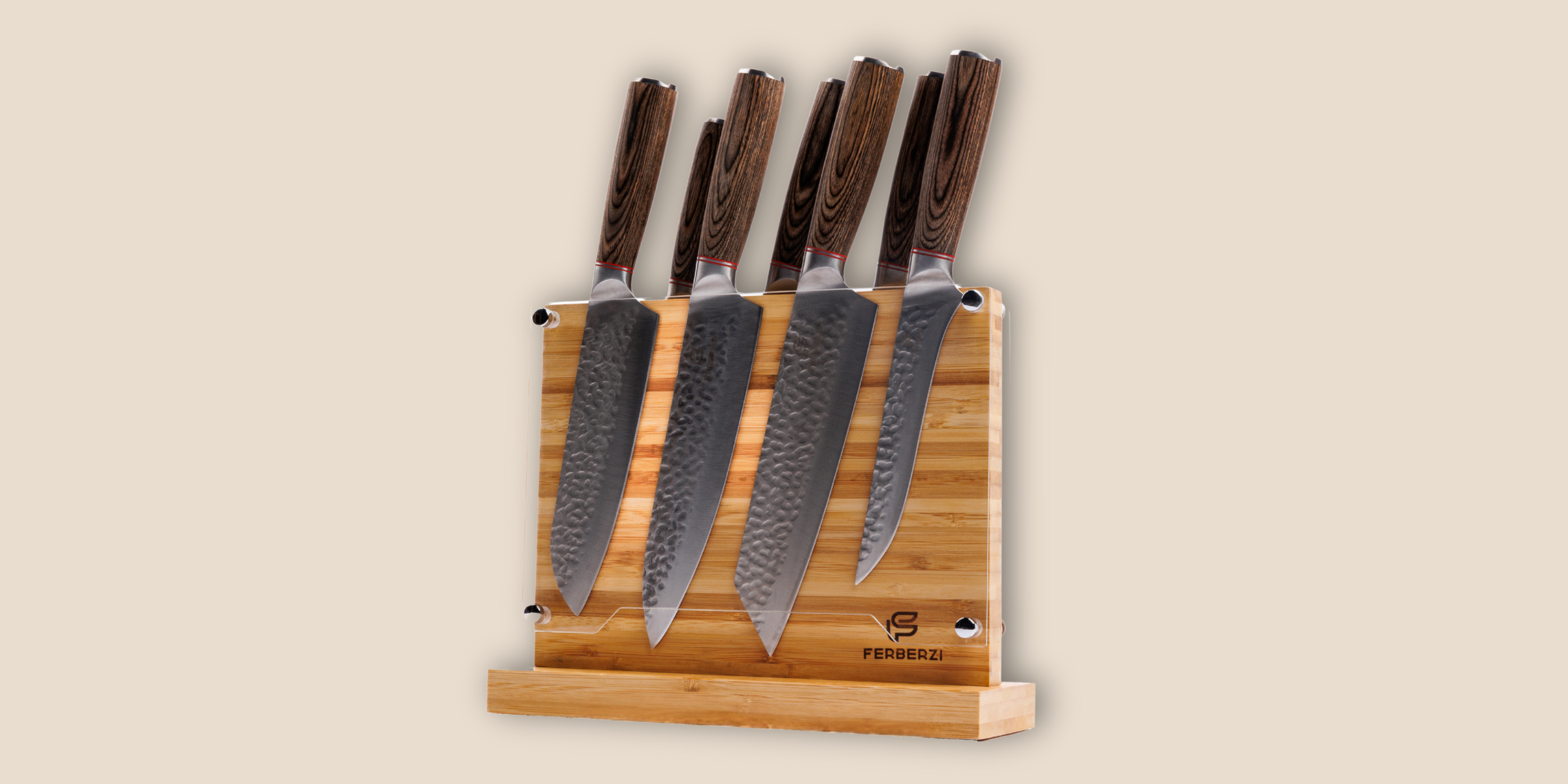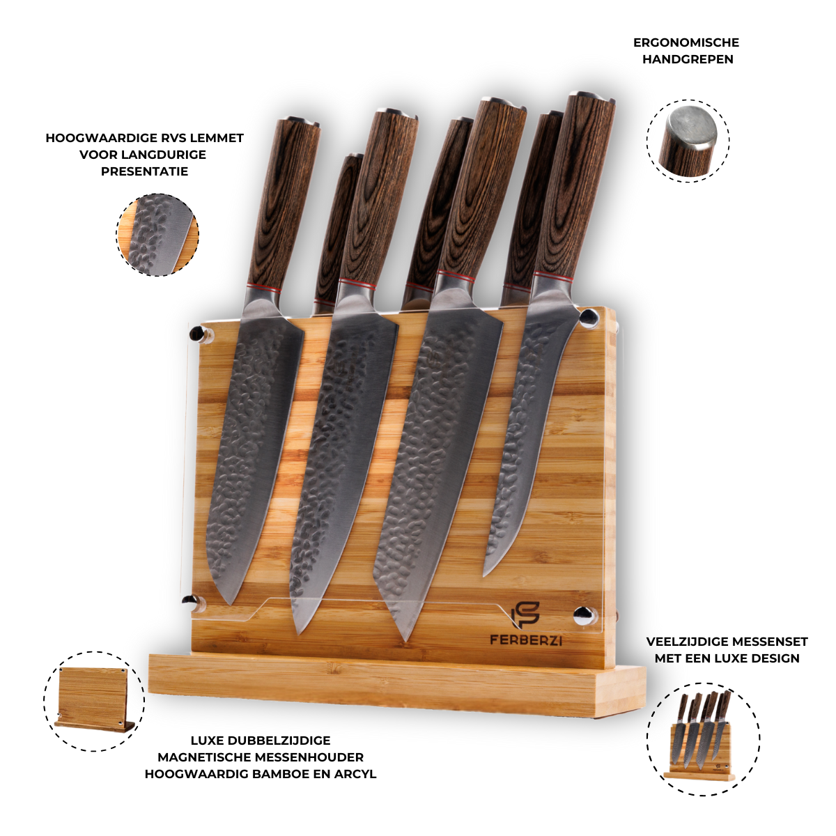 - Dubbelzijdige bamboe/acryl messenhouder – luxe & stabiel